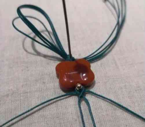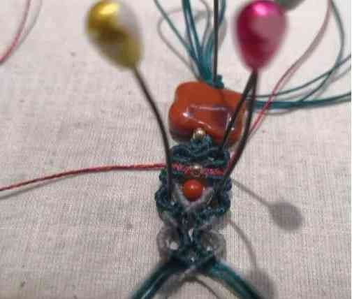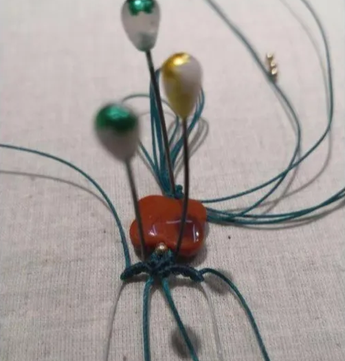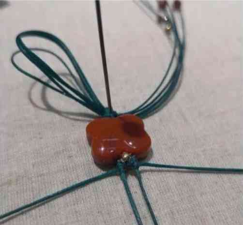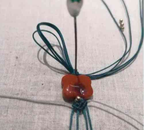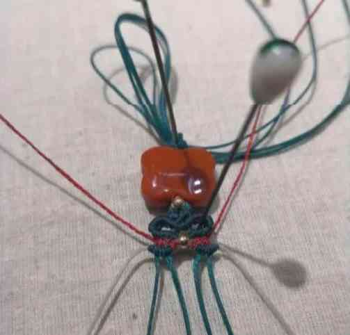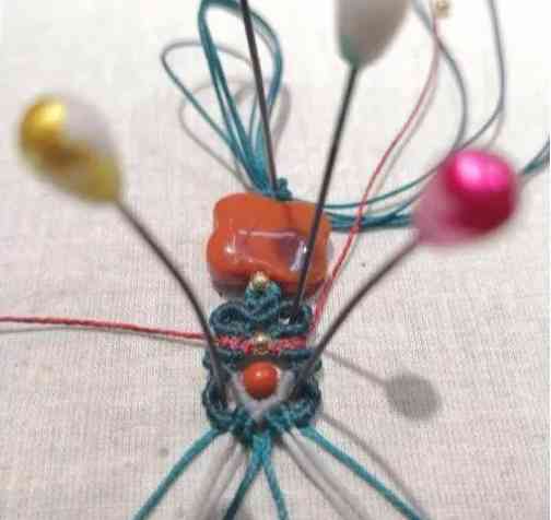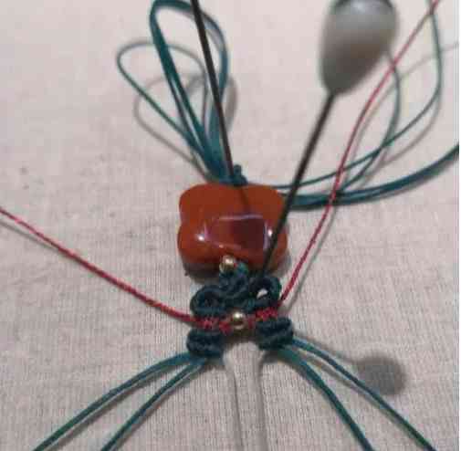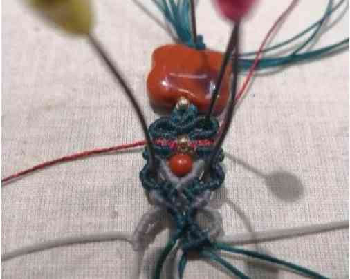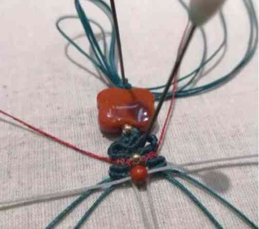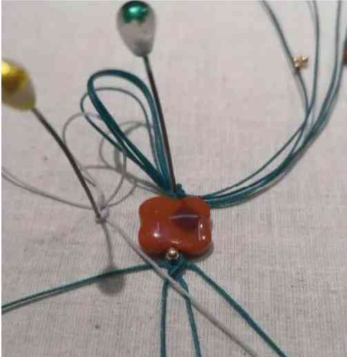 对穿过珠子的两根浅色线做轴线,剩下的墨绿色做绕线在其上面打斜卷结。
