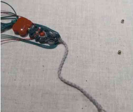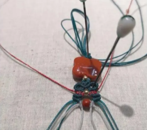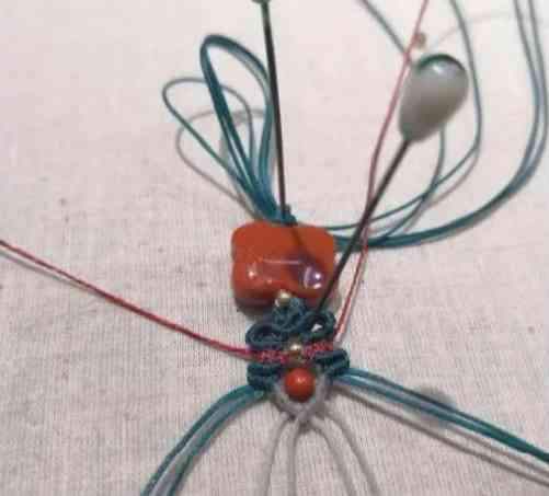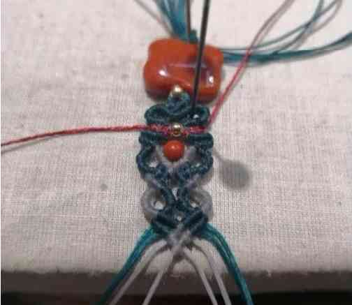 这个时候两根浅色线之间相距的距离较远,取一个大珠子相对而穿,并且孔中再取一根线,浅色线穿过折中。