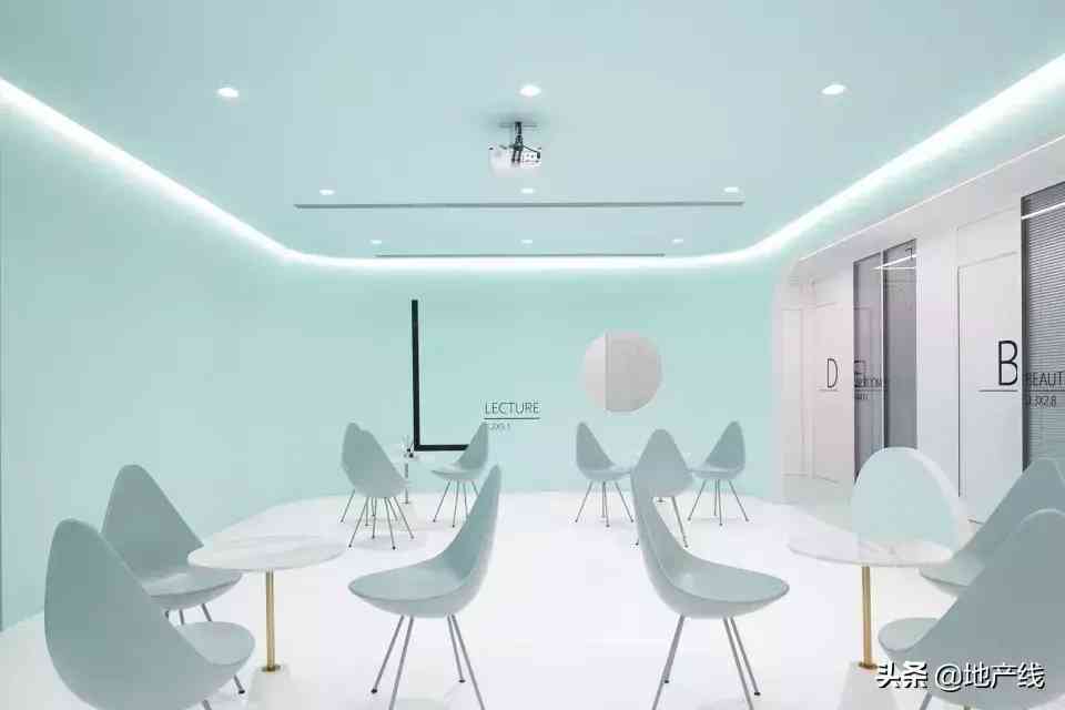 ▼空间一览,以清新的蓝绿色为主色调,overall view of the space in the fresh cyan palette