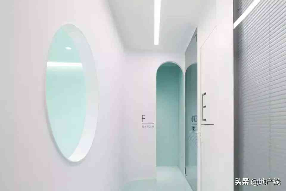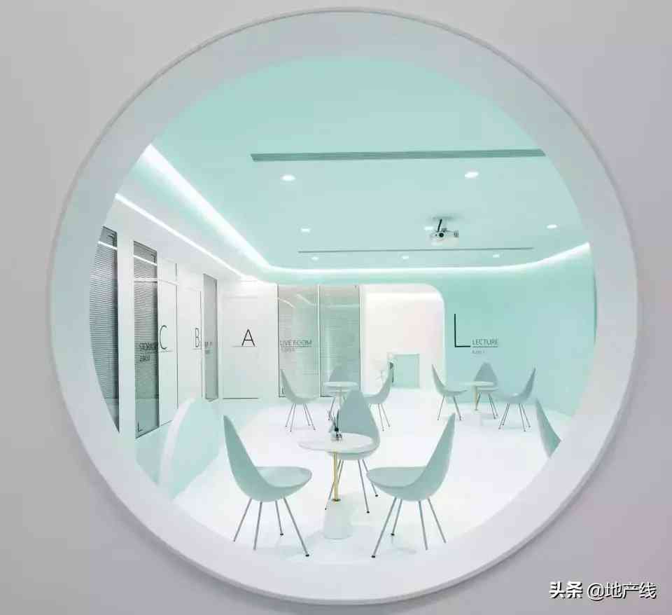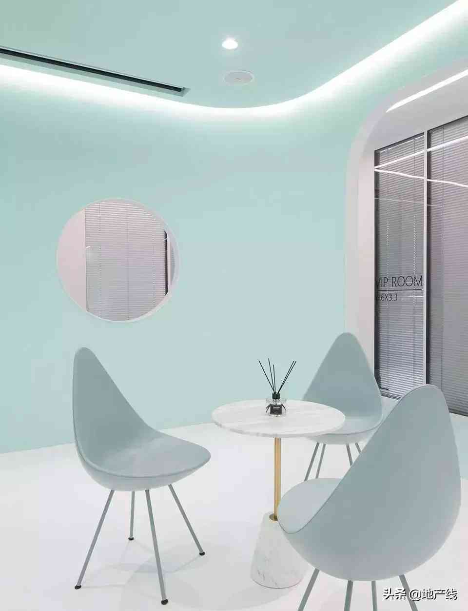 特制的蓝绿色涂料,奠定了清新的基调。墙上的圆形窗洞,能引导视线并提升通透性和层次感,让薄荷味的风灌满空间。