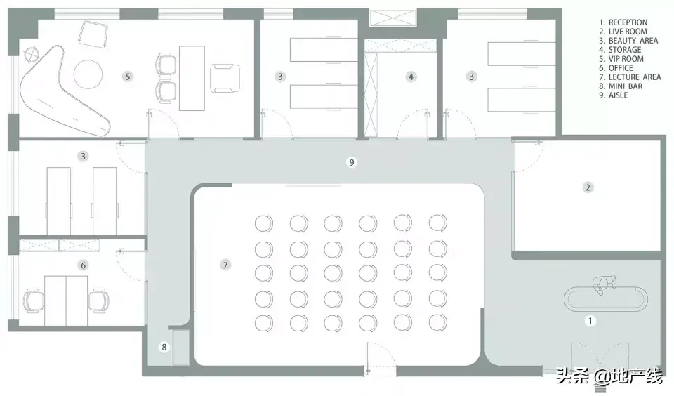 ▼从入口可以看到透明开放的多功能区,view of the open and transparent flexible area from the reception