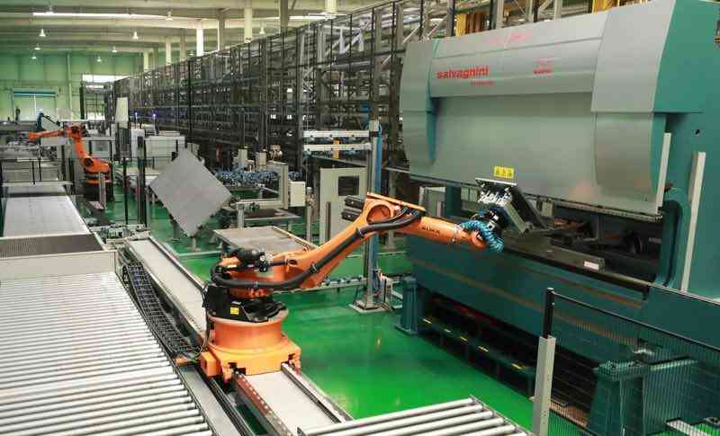 8月2日,长葛市河南森源电气股份有限公司智能生产车间内,工业机器人正在全自动生产输配电设备。记者 聂冬晗/摄
