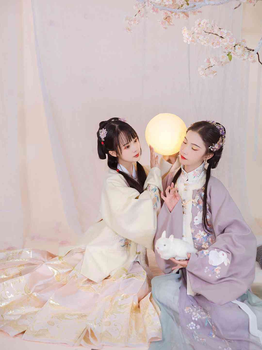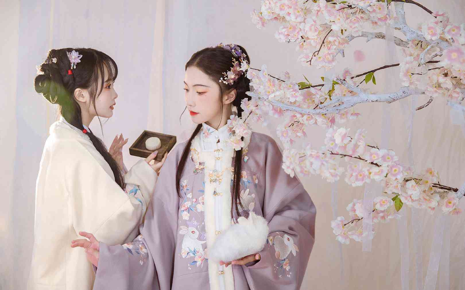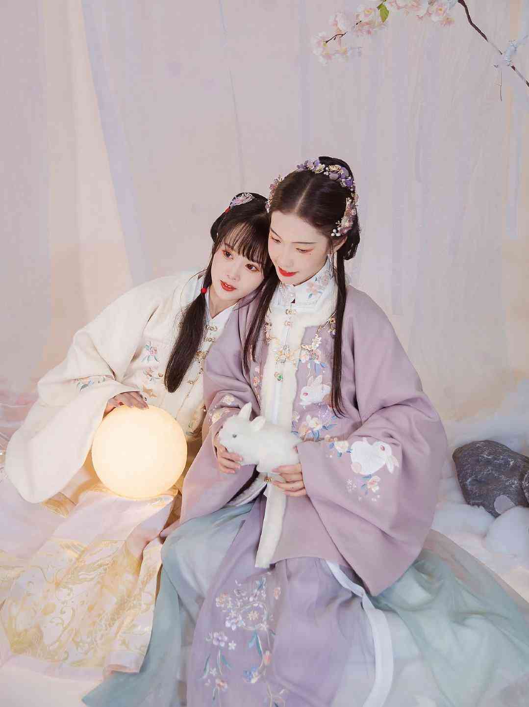 在汉服的选择上面我们可以看到,图中这位小姐姐身上穿的是一件明制汉服,上衣以藕荷色为主要颜色,藕荷色是一种十分温柔的颜色,纽扣处还使用了绒毛做封边,看起来毛茸茸的,增添了一丝可爱感,衣服上面绣满了漂亮的刺绣,其中还有雪白的小兔子,十分精致。