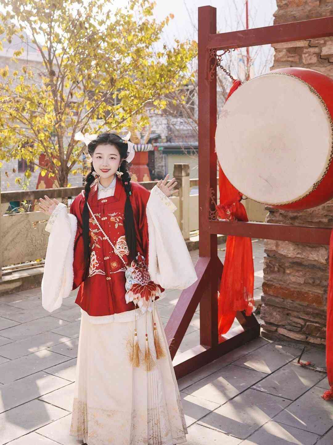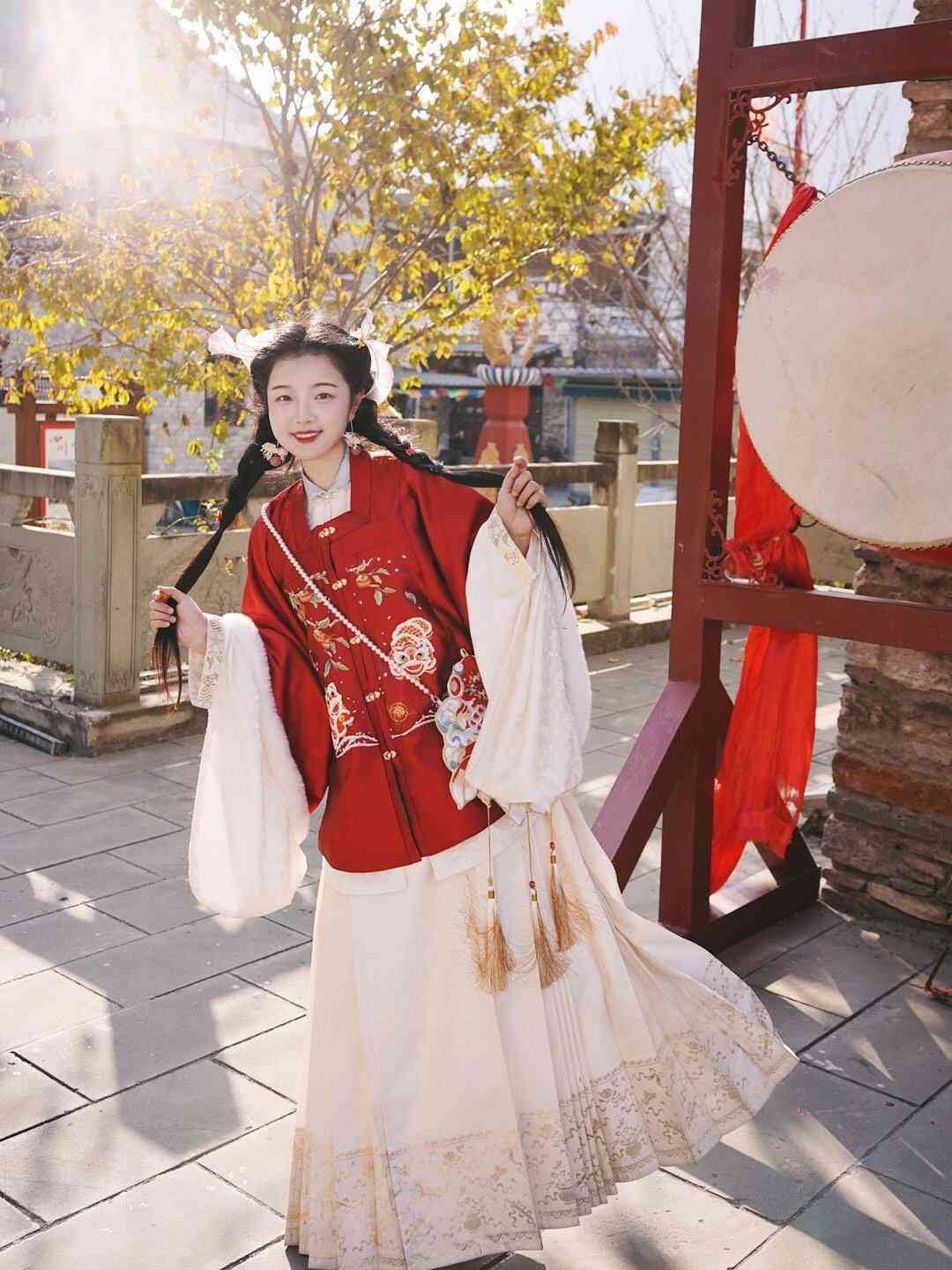 组图里的小姐姐选择的是一套大红色调的汉服,上衣整体都是很亮眼的红色,红色的特点就是热情似火,还带有富贵吉祥的寓意,在衣服两侧还绣有活灵活现的小舞狮,非常可爱。