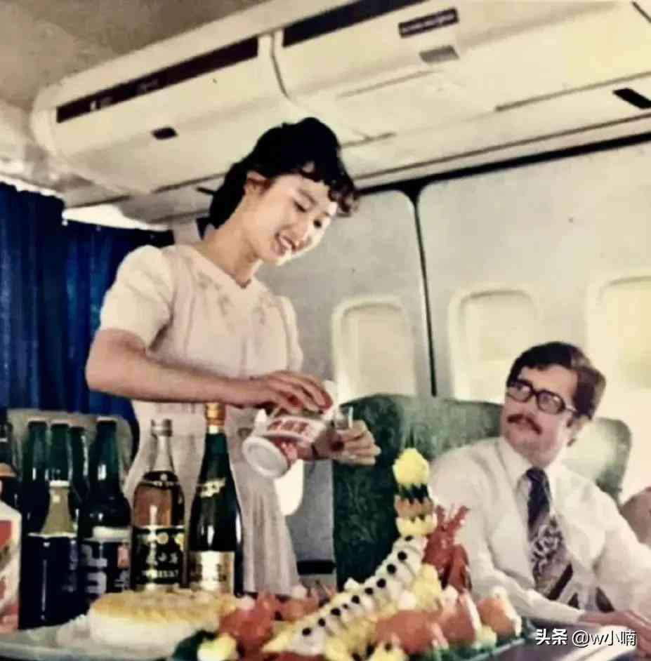 6.1985年,北京。上个世纪,坐飞机头等舱上的旅客。当时他们坐飞机可以免费喝茅台、吃北京烤鸭,甚至还有大龙虾。茅台酒的包装你得佩服它,大牌子就是大牌子。那白瓶子、红标签、斜排版的“贵州茅台酒”字体等,这些产品设计放到今天看都不落伍,而且看着还很舒服,有没有?