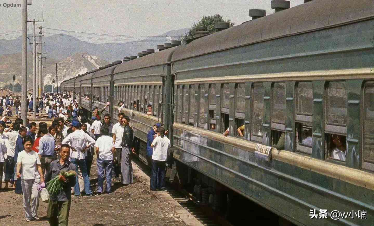 7.1985年,山西。上世纪,在大同的一个小火车站外,由外国摄影人Niek Opdam拍摄的老照片。铁轨上停靠着一辆从北京经包头开往银川的火车,旅客们正在各个车厢上下,戴着蓝帽子的是铁路上的工作人员,这样的绿皮火车如今越来越少见了。这场景有一些冯小刚的电影《天下无賊》的内感觉。