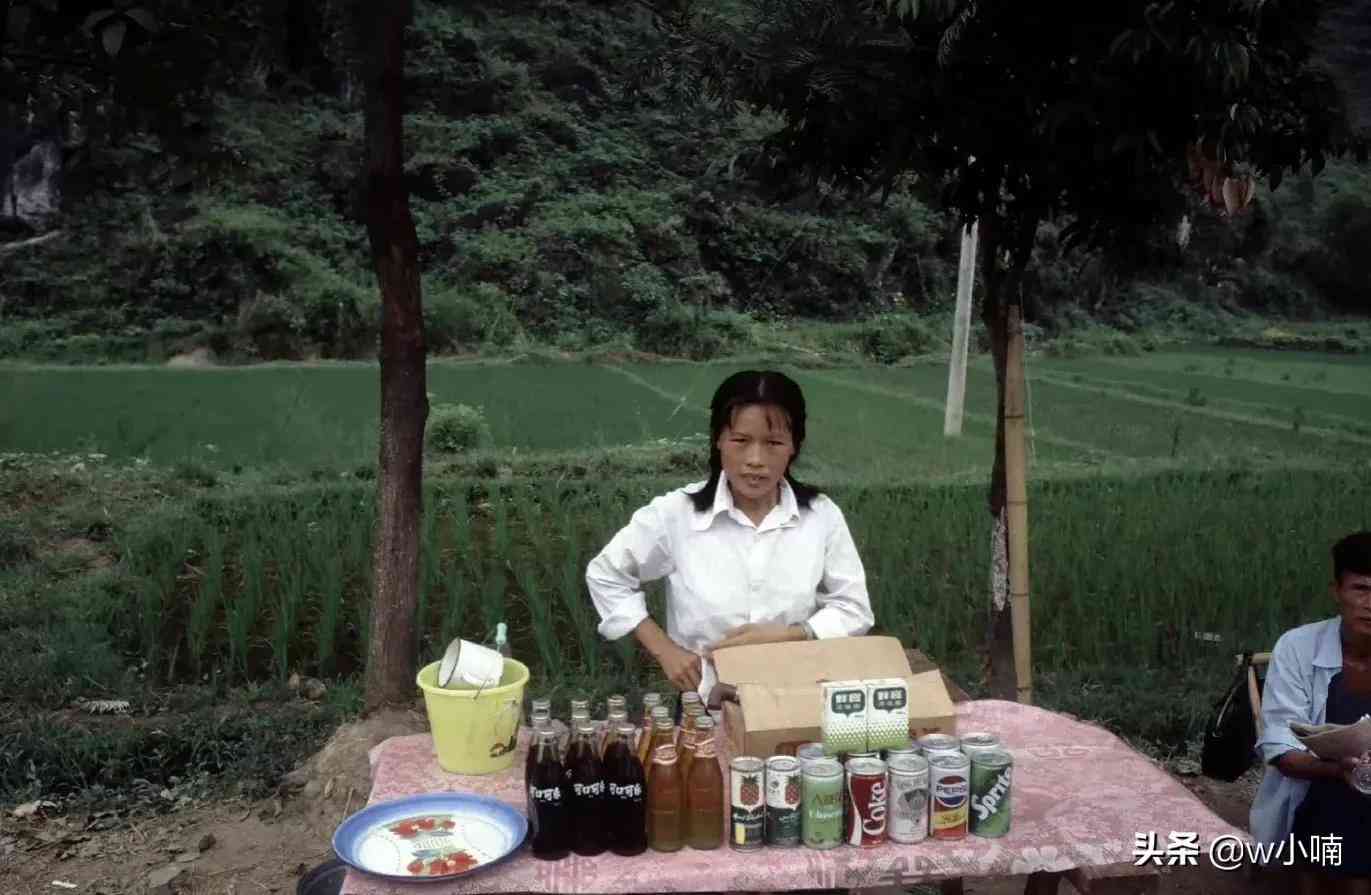 9.1985年,广西。上世纪,桂林象鼻山附近卖汽水的小摊。这是个“丰俭由人”的小摊,在她这里条件好的家庭,可以给孩子喝4元/听的百事可乐、可口可乐,也可喝3元/听的“人参花饮料”。条件一般的家庭可以喝1元/瓶的汽水,再不济的也有一毛钱满满一缸子的甘甜井水。那会儿大人一月挣多少钱呢?
