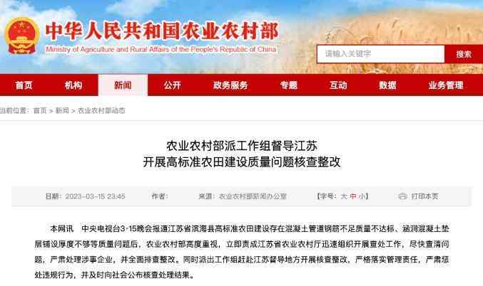 “3·15”晚会报道江苏省滨海县高标准农田建设存在混凝土管道钢筋不足质量不达标、涵洞混凝土垫层铺设厚度不够等质量问题。