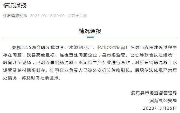 3月16日,“江苏滨海发布”发布情况通报显示,江苏省盐城市滨海县李五水泥制品厂、亿山水泥制品厂在参与农田建设过程中存在问题,滨海县高度重视,连夜查处问题企业,县市场监管、公安等联合执法组时间赶至现场,已对涉事钢筋混凝土水泥管生产企业进行查封,对所有钢筋混凝土水泥管及辅材现场封存。涉事企业负责人已被公安机关传唤到位。后续依法依规严肃查处情况,将及时向社会通报。