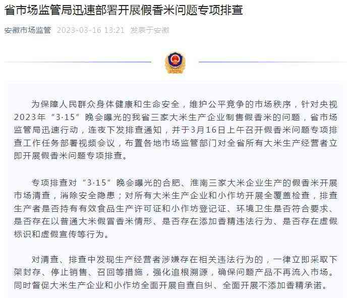 此前,安徽省市场监管局与15日当晚发布情况通报称,合肥、淮南两地市场监管执法人员时间赶赴现场进行查处。安徽省市场监管局已派专人赴两市进行现场指导。声明还称,安徽省市场监管局召开紧急会议,研究部署对全省大米加工企业进行全面排查,整治各类风险隐患,严厉打击违法行为。