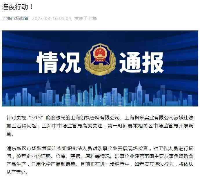 晚会曝光了上海朗枫香料有限公司、上海枫米实业有限公司涉嫌违法加工香精问题。“上海市场监管”16日通报显示,上海市市场监管局时间要求相关区市场监管局开展调查。