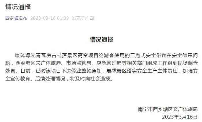 针对“3·15”晚会曝光青瓦房古村落景区高空项目给游客使用的三点式安全带存在安全隐患问题,“西乡塘发布”16通报称,西乡塘区文广体旅局、市场监管局、应急管理局等相关部门组成工作组到现场调查处置。目前,已对该项目下达停业整顿通知,要求景区落实安全生产主体责任,加强安全宣传教育。后续处理情况,将及时向社会通报。