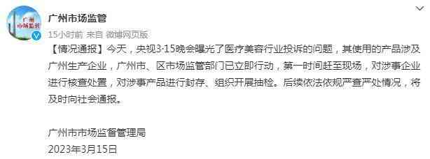 对此,广州市市场监督管理局3月15日晚发布通报称,广州市、区市场监管部门已立即行动,时间赶至现场,对涉事企业进行核查处置,对涉事产品进行封存、组织开展抽检。