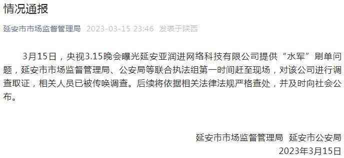 晚会曝光了一些平台售卖直播水军等行为。陕西亚润进网络科技有限公司是被曝光的公司之一。3月15日晚,陕西延安市场监督管理局发布情况通报,市监局工作人员已经前往亚润进网络科技有限公司地址处进行调查取证,相关人员已被传唤调查。后续将依据相关法律法规严格查处,并及时向社会公布。