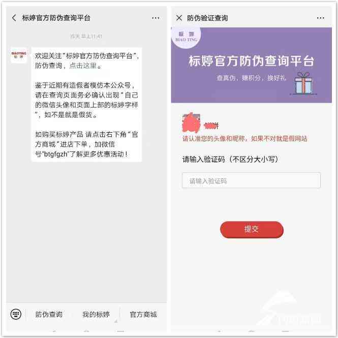 记者关注公众号后出现了一段文字提示,“鉴于近期有造假者模仿本公众号,请务必确认出现自己的微信头像和页面上部的标婷字样,如不是就是假货”。点击查询,果然出现了自己的微信头像和标婷字样。