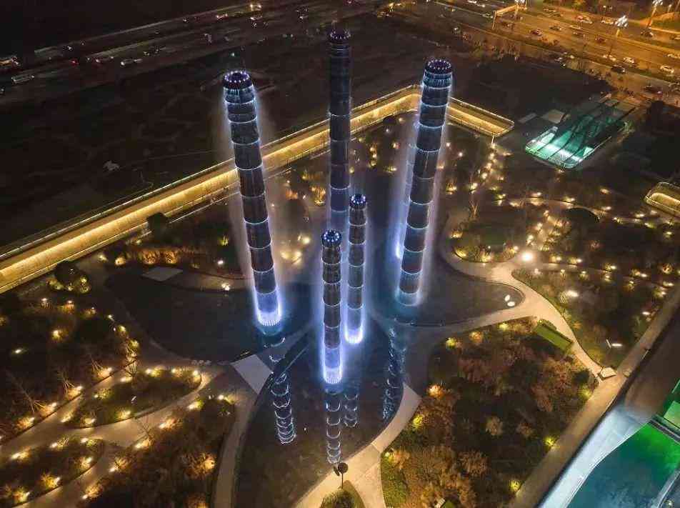 实际上这三高三矮的柱子,是景观水柱,被命名为“生机之塔”,景观水柱的水是由上至下流淌,意指天府之国的天上来水;柱身配备有环形彩灯,当夜幕降临会有七彩渐变、环状灯带等多种形式灯光。