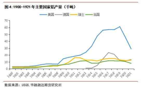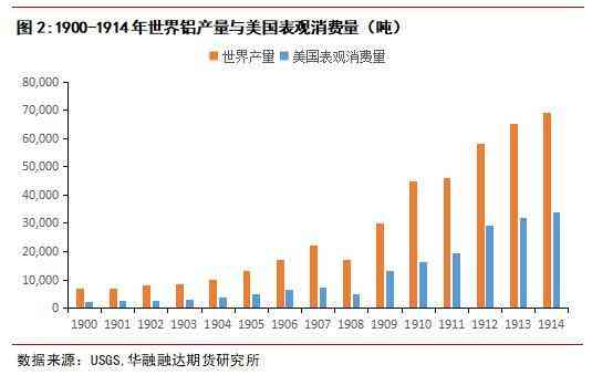 战争迅速推高铝的产量,1900年世界铝产量为6800公吨,而到1916年,铝年产量已超过10万吨。战争结束后,需求迅速回落,1921年铝的实际价格暴跌至4430美元/吨。