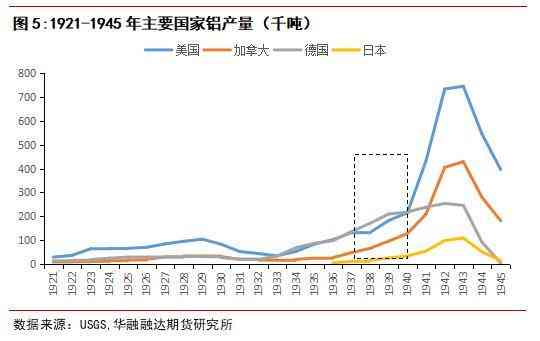 次世界大战后,铝被当作一种重要的战略资源,德国开始积极扩充铝的产能,1939年,德国已是世界上产量最大的铝生产国。而美国则凭借强大的金融力量向铝行业注入大量资金,战争期间铝行业迅速扩张,1942年美国铝的年产量达到了744千吨,而1939年这一数字是182千吨。铝价在战时被正式控制在331美元/吨。