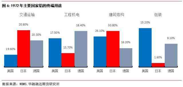 消费方面,1967年可口可乐和百事可乐开始出售铝罐饮料。铝包装的发展进一步加强了铝回收业的发展。根据WBMS的数据,1972年西方国家从废料中回收的铝约占西方世界铝总消费量(一次和二次)的21%。这一时期的铝的终端消费主要集中在交通运输、工程机电、建筑结构,铝包装行业开始兴起,不同国家之间的消费结构差异较大。