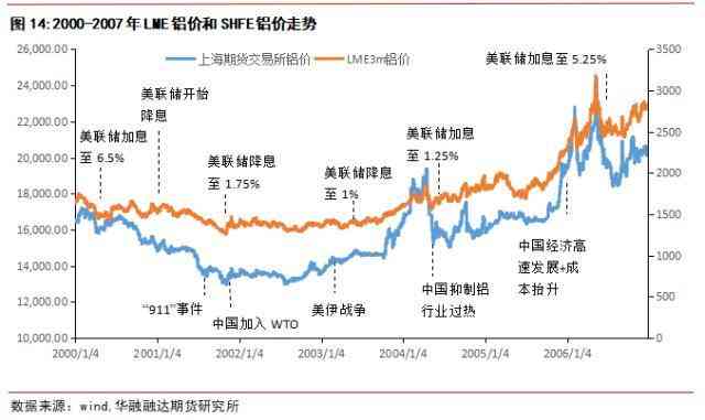 进入21世纪,为了抑制经济过热,美国提高其利率至6.5%。美国互联网泡沫随后破裂,GDP小幅收缩,失业率上升,并导致长达8个月的经济衰退。“911恐怖袭击”加剧了美国经济问题。铝价此时震荡下行,LME铝价在2000年初的1680美元/每吨,回落至2001年末的1325美元/吨。国内上海期货交易所(以下简称SHFE)铝价则从17000元/吨,回落至13250元/吨。