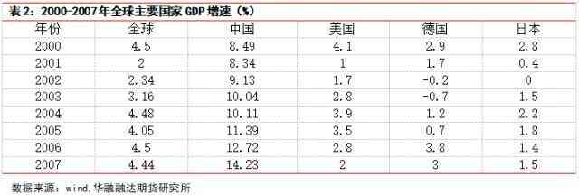 2000-2007年全球GDP平均增速为3.68%,中国平均GDP增速达到了惊人的10.55%,而美国、德国和日本平均GDP增速分别为2.72%、1.55%和1.45%。中国经济的崛起也带动了全球经济的复苏。