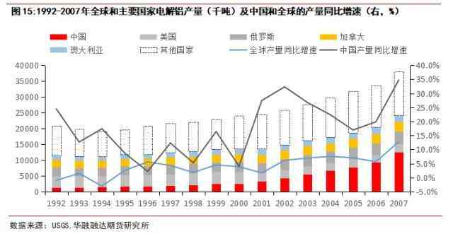 中国经济的快速发展带动全球电解铝产量迅速扩大,到2007年全球电解铝产量超过了3800万吨/年,其中中国产量达到1260万吨/年,全球产量占比达到33%,稳居。2000年以后全球产量平均增速6%,而中国平均增速达到了23%。全球的电解铝产量中心转移至中国。