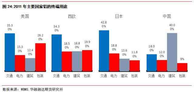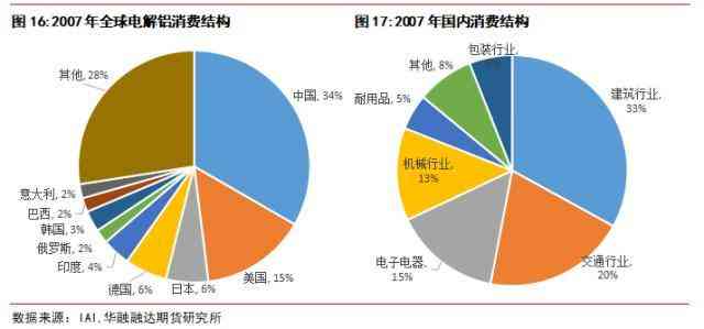 中国现在在全球消费中扮演着领导角色,其市场份额从1972年的2%膨胀到2007年的34%。国内消费建筑行业用铝占到33%,其次是交通运输行业20%,电力行业和机械行业分别占比为15%,13%。