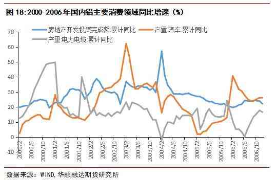 铝的终端消费也异常强劲,受益于我国持续增长的房地产投资和汽车消费,房地产投资完成额累计同比增速、汽车产量累计同比增速和电力电缆产量同比增速在2000年-2007年平均累计同比增速分别达到了27.7%、21.9%和17.6%。