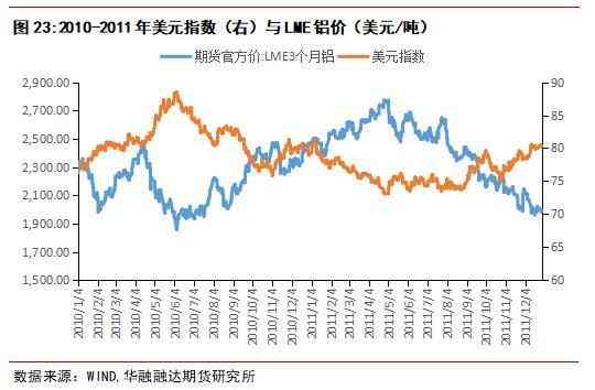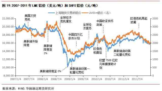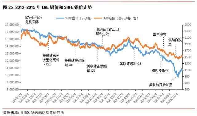 2010年中欧盟通过了7500亿欧元希腊援助计划,欧债危机得到缓解,欧元触底反弹。美国则在高失业率与经济放缓的背景下,推出了第二轮量化宽松。美欧之间的基本面差异让美元持续走弱,加上中国原铝需求高速增长,LME铝价反弹至2011年5月的2614美元/吨,而SHFE铝价则受制于国内紧缩的货币政策,没有大幅跟涨。