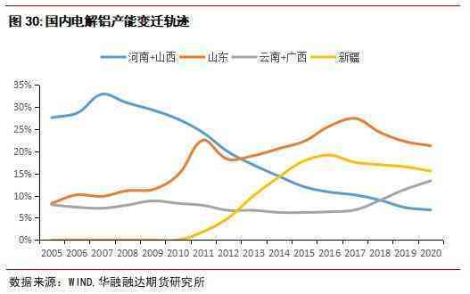 国内电解铝轮产能迁移(2010-2016年):从资源聚集地向能源聚集地转移。2010年前国内电解铝分布相对稳定,主要集中在河南、山西、山东、广西、贵州等铝土矿资源丰富的区域。2010年国家出于限制高能耗企业取消优惠电价,电解铝往新疆、山东迁移,能源集聚地的电解铝自备电时代崛起。