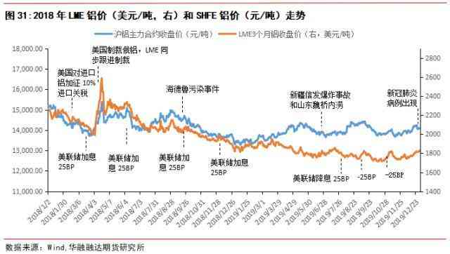 2018-2019年国际铝价走势呈现震荡走弱,2018年期间有过两次明显的事件性行情。一是俄铝制裁事件,俄铝货流不能正常进入交割,并且全球铝供应可能出现6%以上的供应下降,导致全球性恐慌,LME铝价从1977美元/吨的低位,半个月的时间暴涨至2587美元/吨,涨幅达到30%。沪铝也从13715元/吨的低位最高涨至15035元/吨,涨幅9%。国内涨幅明显低于LME涨幅,因为我国是国际铝主要生产国,并且俄铝有流入国内预期。随着4月下旬美国延缓了对俄铝的制裁,LME铝价和沪铝均回吐前期近一半的涨幅。第二波事件性拉升来自海德鲁污染事件导致的减产,海外氧化铝供应骤然短缺,期间LME最大涨幅达10%,而同时国内因环保政策推动铝土矿报价快速拉涨,导致沪铝亦形成一波同期上涨,最大涨幅接近7%。而后随着俄铝制裁的落地,海德鲁逐渐复产,美联储加息带来的全球的需求疲软的问题开始显现,加之国内生产仍小幅维持增长,铝价一路走弱,截至2018年12月底,LME铝价全年跌幅18.73%,国内铝价底部成本支撑较海外强烈,12月跌幅低于海外,最终全年跌幅10.74%。