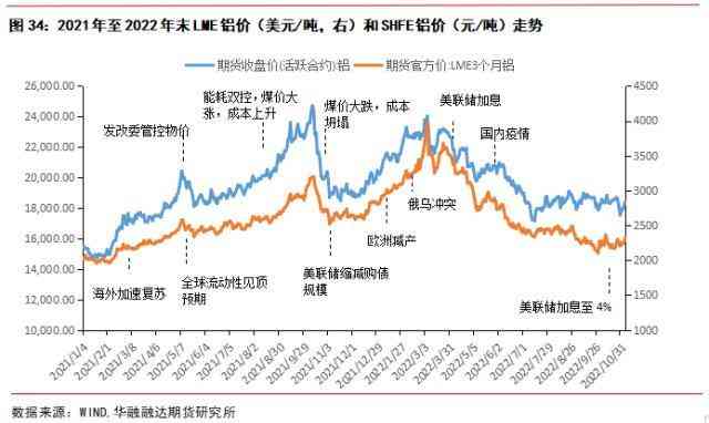 2021年至2022年末铝价继续走出波澜壮阔的行情,沪铝自2021年初的15340元/每吨最高涨至2021年10月份的24695元/吨。之后又震荡回落至2022年末的18350元/吨左右。LME铝价则从2025美元/吨,涨至2022年3月上旬的最高价3966美元/吨。之后又大幅回落至2022年末的2300美元/吨。价格运行逻辑主要可以分为以下几个阶段:阶段(2021年1月-5月中旬):海外经济加速复苏,拜登上台后经济刺激政策加码,通胀快速上涨,叠加国内进入消费旺季,铝价迎来一波需求驱动的快速上涨。
