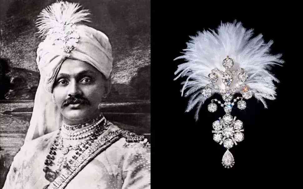 这件夺目的白羽毛钻石配饰的主人必须也是位男同胞,没错,就是照片中这位纳瓦纳加尔的王公拉吉特辛吉。他可是一位珍贵宝石和珠宝鉴赏的大行家。因为置于头顶上方最醒目的位置,头巾配饰对于印度王公来说意义非凡,既能给路人直击灵魂的冲击,又足以显示自己尊贵地位。