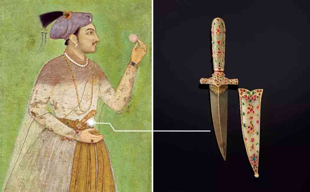 这位手中拈花的英俊男子便是贾汉吉尔,印度莫卧儿帝国第四位皇帝,阿克巴大帝的长子。他是一个爱好艺术与文化的皇帝,热爱大自然,喜欢花卉,善于作画,更是多情,娶了一位貌美的波斯移民后代宫女做皇后。从其腰间佩戴的短剑上精致镶嵌的珠宝,也能看出一二他的浪漫性格,不知道他是否曾用这把短剑为心爱之人摘取一朵玫瑰呢?