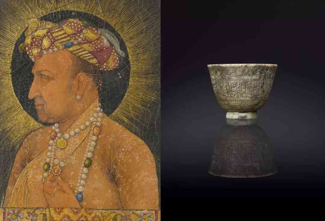 贾汉吉尔对酒和鸦片也有很大的兴趣。他不到30岁时,每天就要饮20瓶加鸦片的亚力酒。这样对酒情有独钟的皇帝,对盛酒的容器也是绝不马虎的。这只玉制酒杯是由贾汉吉尔皇帝亲自定制的,以中国瓷器造型为基础,是迄今为止已知最古老的有确切纪年的莫卧儿帝国玉器。酒杯外部装饰有皇帝的名字和头衔以及两首波斯诗歌的四行诗节,充分体现了他对美酒和诗歌文化的欣赏。