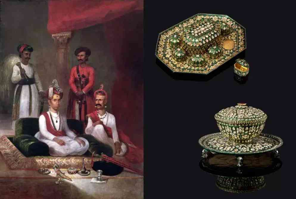 王公们的下午茶也要优雅讲究。在正式的宫廷朝会等礼仪场合,主人为了显示对宾客的尊敬,必然要端上高贵的容器、杯器配以美味的佳肴来款待。皇室喝茶聊天更要喝出身份喝出品格。据记载,莫卧儿皇帝贾汉吉尔所用的是镶满宝石的有盖金杯,配有黄金托盘和镶满钻石、红宝石和祖母绿的杯盖。图中这一整套装饰华美的小盒都是用来装槟榔块的。约上三五好友,喝点茶嚼个槟榔打打牌,兄弟们的下午茶时光也会很嗨皮!