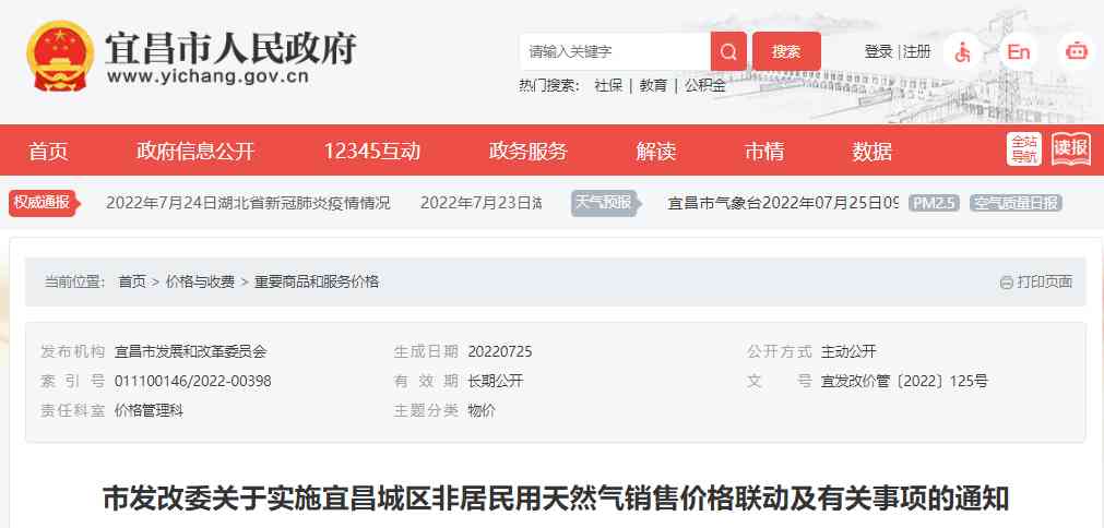 7月25日宜昌市发改委发布《关于实施宜昌城区非居民用天然气销售价格联动