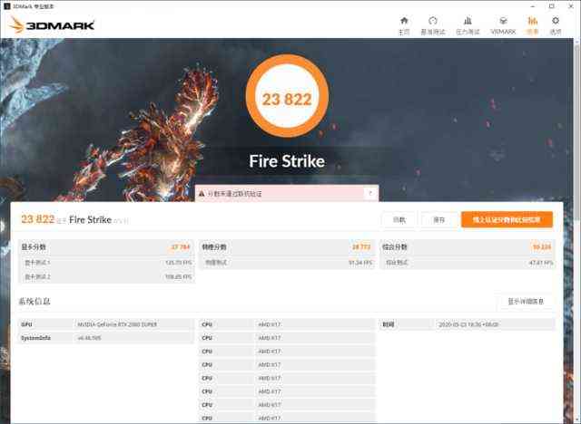 接下来看看RTX 2080SUPER显卡的测试,我们通过3DMARK?模拟多重游戏场景,分别在FireStrikeExtreme、FireStrikeUltra、FireStrike的测试中取得了13344、6945、23822的好成绩,基本反映了RTX2080SUPER的正常水平,3A大作基本可以碾压。