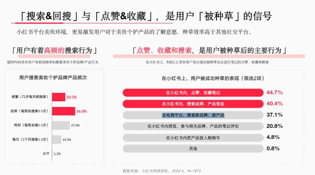 从美妆品类的种草转化角度来看,其中接近9成的小红书美妆用户群体均表示购买了被种草过的品牌产品,期间里她们也会通过对笔记的点赞、收藏以及具有高频率特性的主动搜索相关品牌产品信息这3个行为轨迹作为对眼前产品感兴趣的信号。这也是品牌方在小红书进行内容营销推广的主要核心目的,即完成种草阶段。