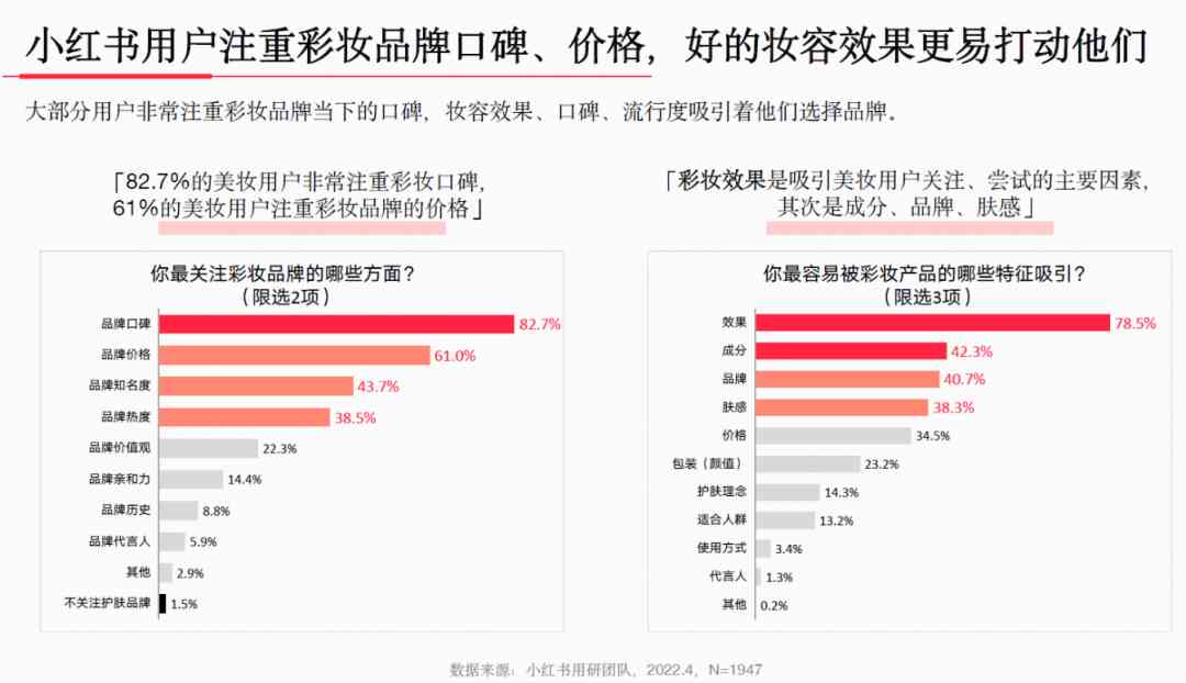 小红书美妆用户对于护肤品类的购买动机容易被其当下的护肤观念影响,而对于彩妆的影响主要来自潮流趋势的流行。