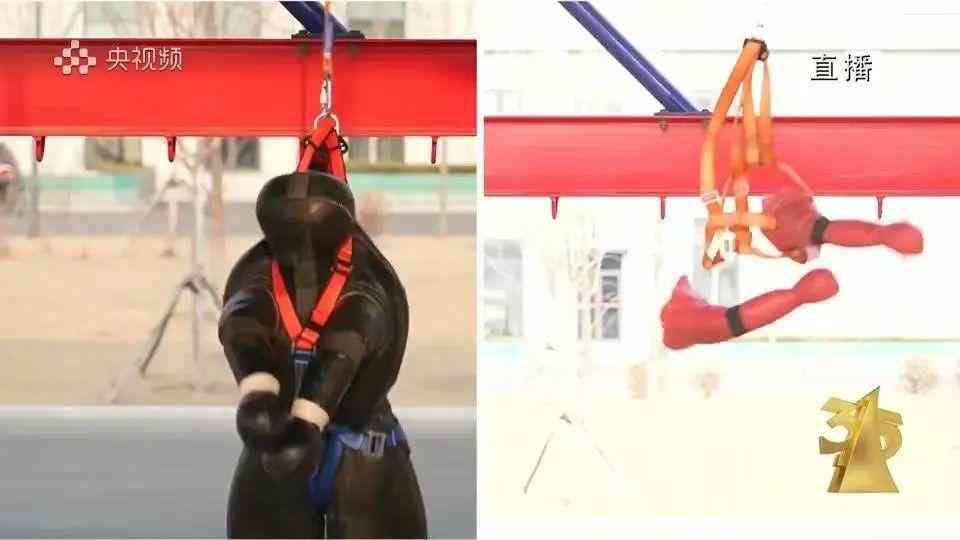 3·15晚会联合国家消防救援局,进行了安全测试。这个离地7米高的实验台,模拟高空游乐项目,消防员为身高1.7米,重量60公斤的道具假人穿戴好三点式安全带。消防员释放假人,模拟游客在吊桥上自然坠落。安全带发生严重位移,假人腰部安全带被扯到腋下,背部的安全带勒在了假人的脖颈处。