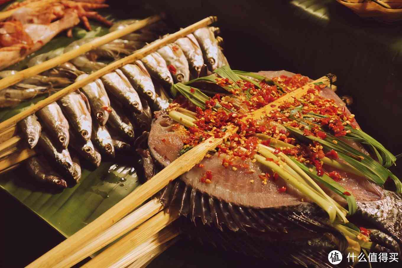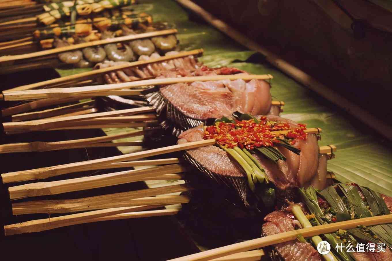 4、我们晚上吃的一家叫“傣庄园-正宗傣味餐厅”,菠萝饭一般般,香茅草烤鱼肉质比较嫩,外焦里嫩还不错。烤鸡很好吃,必点!外酥里嫩,烤的比较干但是不柴,配的辣椒很够味。五花肉刚烤完比较好吃,放久了口感比较Q也有点腻,烤五花、烤鸡、烤排骨给的蘸料都是一样的。包烧豆腐无功无过,傣味年糕不喜欢糯米和甜的就不要点了。总的来说味道中规中矩,不惊艳。如果想体验特色的西双版纳小吃,可以去星光夜市觅食。