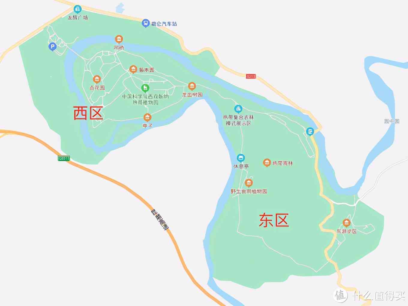 中科院植物园非常大,分为东区和西区,如果时间不够可以只逛西区(建议买游览车)。如果想要住在景区里面,景区有一个王莲酒店(西区,位置很方便),可以买东区车票,毕竟东区比较远,西区可以走路慢慢逛,步行完全ok。现在门票半价40元,游览车西区50元,东区+西区100元。先给大家附张地图更清晰一点: