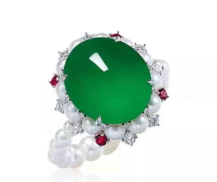 缅甸天然翡翠蛋面配钻石及珍珠戒指