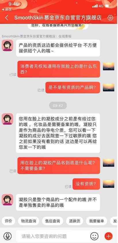 金女士与客服对话询问商品资质和成份,对方让去医院做过敏原测试