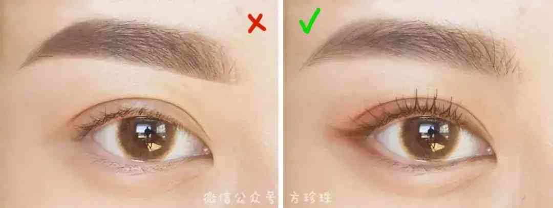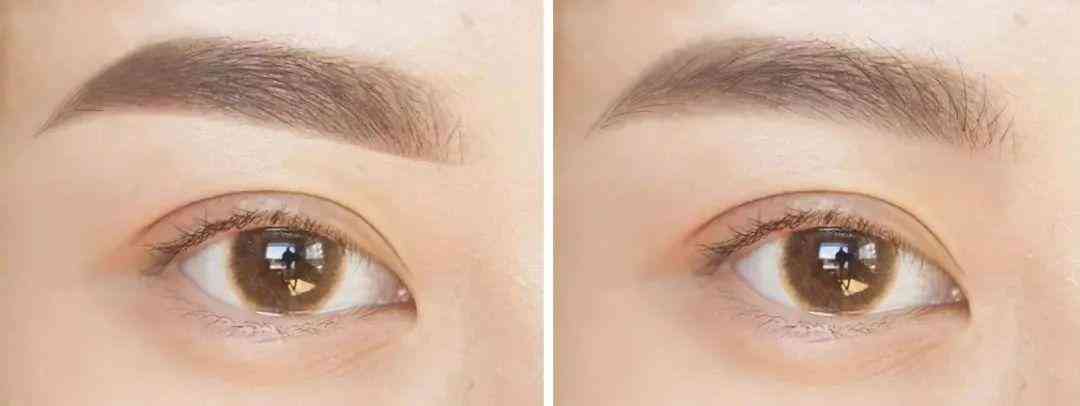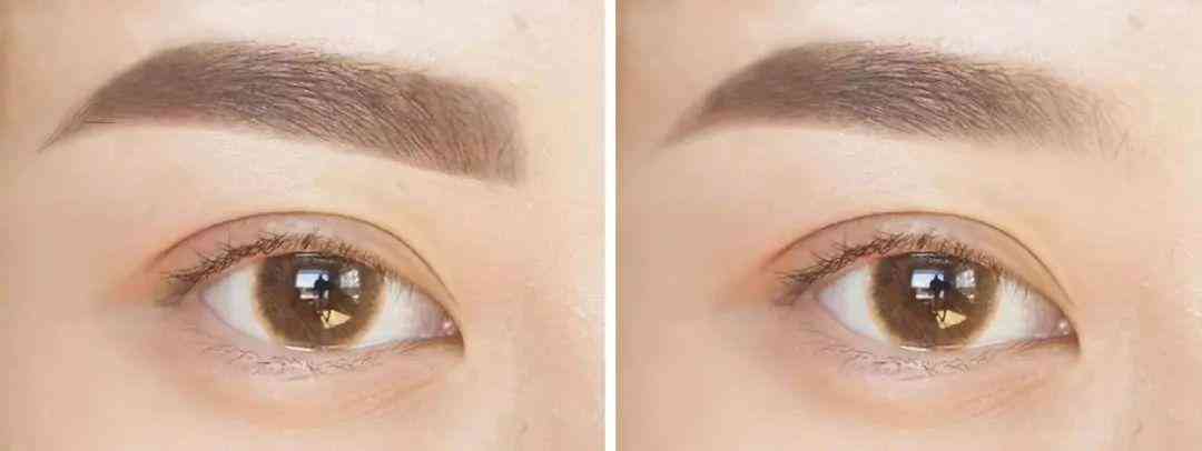 眉头呆板(左)比眉头柔和的妆感重: