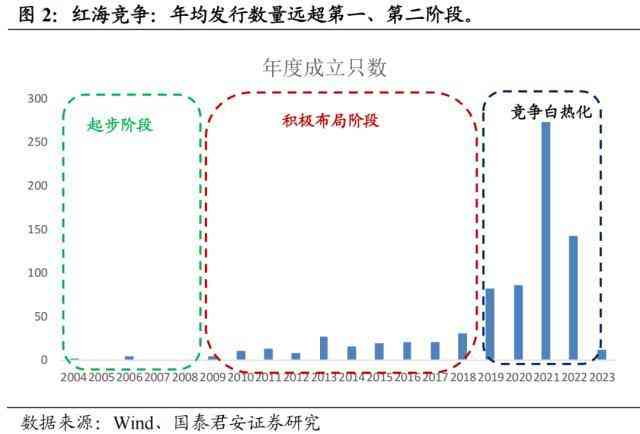 2019年至今:红海竞争。中小公司纷纷开始布局ETF产品线,ETF上报和发行节奏加速,2019-2022年累计发行584只ETF产品,年均发行数远超阶段及第二阶段。