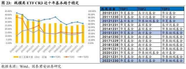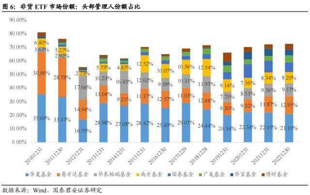 在这一阶段,逐渐形成了所谓的ETF中的头部管理人,行业马太效应出现并不断加强,头部管理人的特征是:旗下ETF产品线布局较全、有代表性的规模较大的单只ETF产品、人员配备完善有单独的指数部门,典型的公司例如华夏基金、易方达基金等。