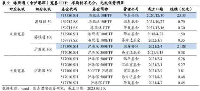 相较于A股ETF的竞争白热化,跨市场布局的ETF仍非常欠缺,主要体现在产品规模小、布局方向少这两个特点。我们认为跨市场宽基指数是值得关注的布局机会,原因有:1)优质资源的稀缺性:随着港股通扩容,港股优质资产进一步纳入互联互通机制,跨市场产品有望成为热点;2)资金容量大,发展潜力大:指数资金容量大,但目前跟踪产品数量少,规模小,依然有较大潜力发展,而且相较于使用QDII额度投资的恒生指数ETF,港股通指数或沪港深指数不占用基金公司的QDII额度,容量受限程度较低;3)先发优势明显,抢先布局效果好:同类产品先发优势明显,加之当前产品数量少,赛道拥挤度低,抢先布局有望获得好效果。
