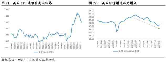 联储加息周期或临近尾声,继续关注黄金投资机会。美联储在经济下行压力、通胀边际改善的背景下有望放缓加息,叠加通胀中枢或维持高位、美元指数有望下行等因素,全球滞胀风险加大,金价上行压力有望缓解,配置价值凸显。美国CPI回落,由高点的9.1%下降6.0%,至可见美联储加息带来的通胀降温效应初步显现。与此同时,美国面临的经济衰退风险正在加剧,制造业PMI连续走弱,于2022年年底跌破荣枯线、通胀边际改善,叠加加息抑制通胀具有一定的滞后效应,美联储有望放缓加息步伐,利好黄金价格上行压力的释放。